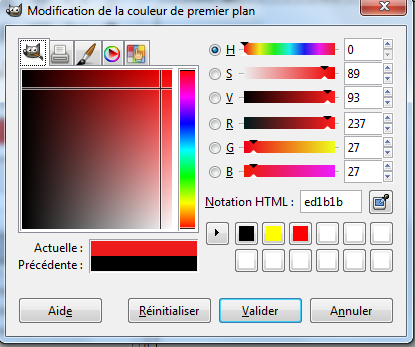 Ce n'est ni plus ni moins que le choix de la couleur. Cliquons sur le noir. Une fen^tre apparait nous demandant de choisir une couleur. Bidouillez les paramètres et validez.